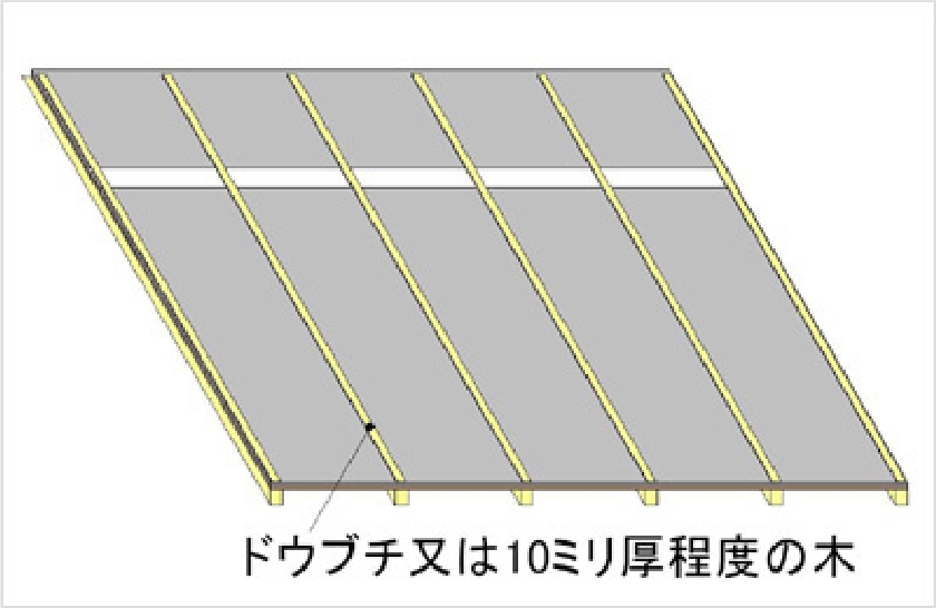 垂木のピッチに合わせて、垂木方向にドウブチ(10mm厚程度の木)を打ちます。